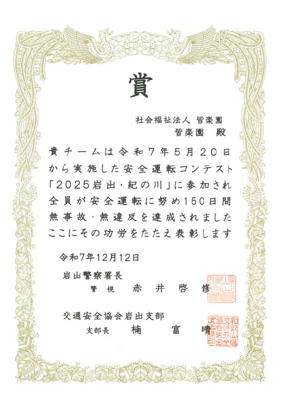 NEWS 法人本部 2025安全運転コンテスト 2025.12.15 岩出警察及び交通安全協会岩出支部主催「安全運転コンテスト2025岩出・紀の川」の参加メンバーが150日間、無事故無違反を達成し表彰されました。 一覧に戻る